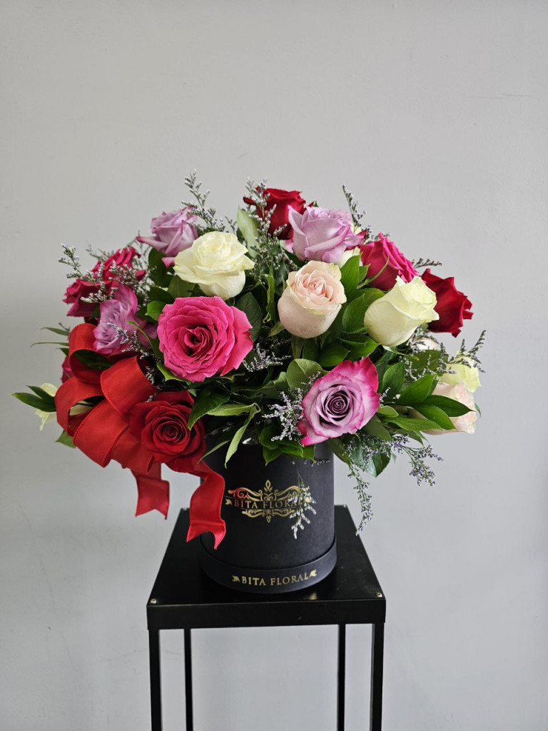 Assoted colours will include red, white, light pink, hot pink roses with babys breath